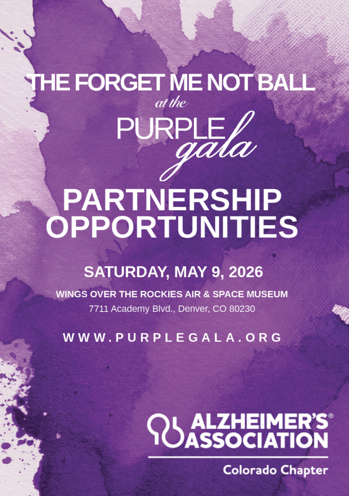 Corporate Sponsorship Partners are essential in supporting those living with Alzheimer’s disease and their caregivers. Start today as a Sponsor of the Forget Me Not Ball at the Purple Gala with the Alzheimer’s Association of Colorado. Your investment as a sponsor will raise vital funds and elevate awareness to underwrite the Alzheimer’s Association’s support, education, advocacy and research efforts.